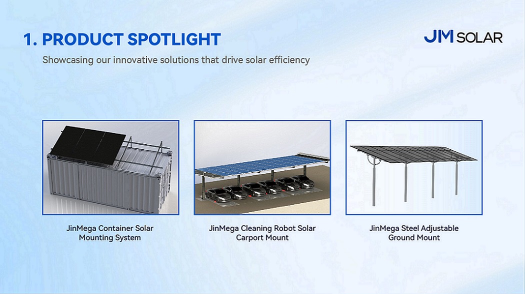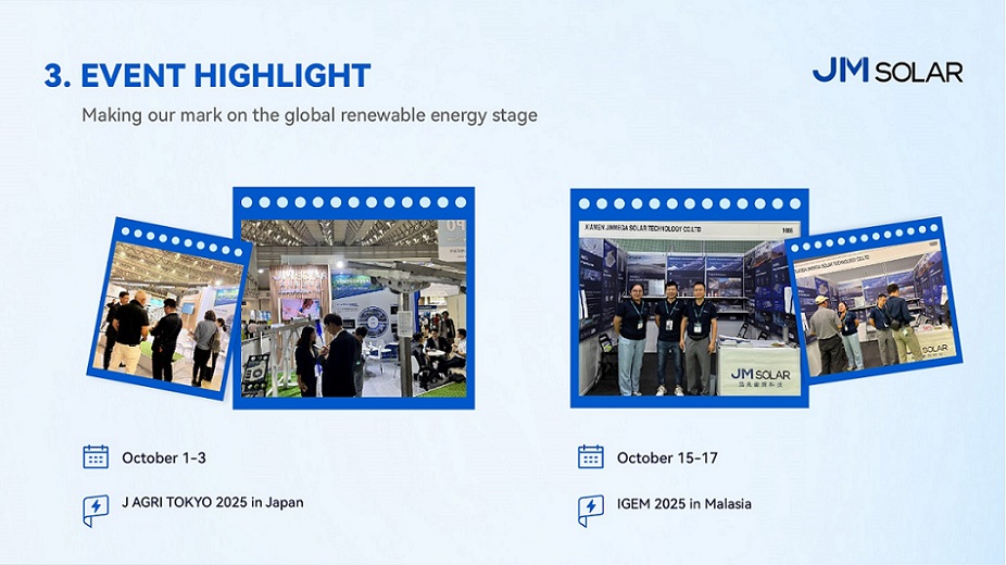 在 J AGRI TOKYO 2025我们展示了专为农业太阳能应用场景量身定制的安装解决方案,引起了日本市场的浓厚兴趣。不久之后,在 2025年马来西亚IGEM展会JinMega 展示了多功能的屋顶和车棚解决方案,现场讨论重点关注实用性、耐用性和本地化项目需求,使这些活动成为建立新合作关系的关键接触点。